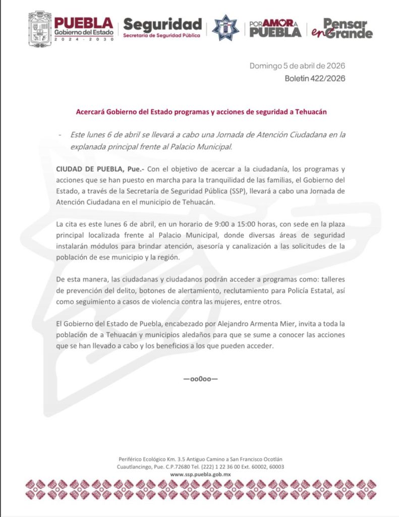 CIUDAD DE PUEBLA, Pue.- Con el objetivo de acercar a la ciudadanía, los programas y acciones que se han puesto en marcha para la tranquilidad de las familias, el Gobierno del Estado, a través de la Secretaría de Seguridad Pública (SSP), llevará a cabo una Jornada de Atención Ciudadana en el municipio de Tehuacán.