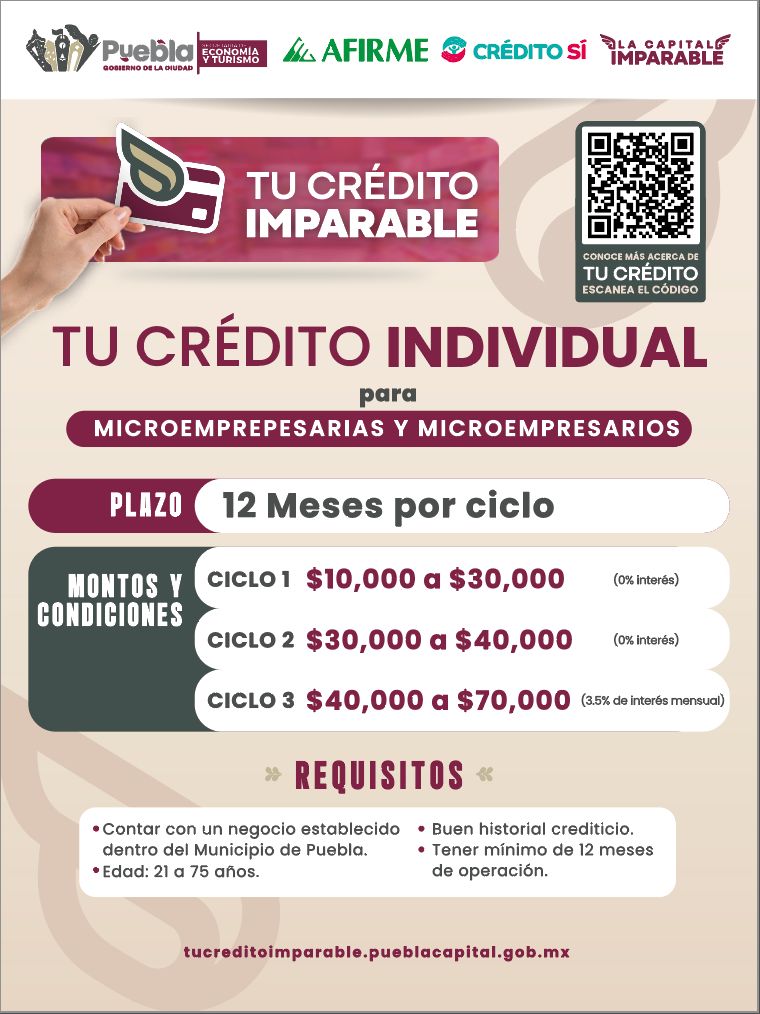 Puebla, Pue., 22 de marzo de 2026.- El programa de créditos accesibles y justos para personas empresarias y emprendedoras de la ciudad de Puebla, Tu Crédito Imparable 2026, en sus tres modalidades: Tu Crédito Mujer, Tu Crédito Individual y Tu Negocio Sí Plus, ya está abierto para el financiamiento de proyectos productivos o Micro, Pequeñas y Medianas Empresas (MyPimes), con cero o mínimo de intereses.