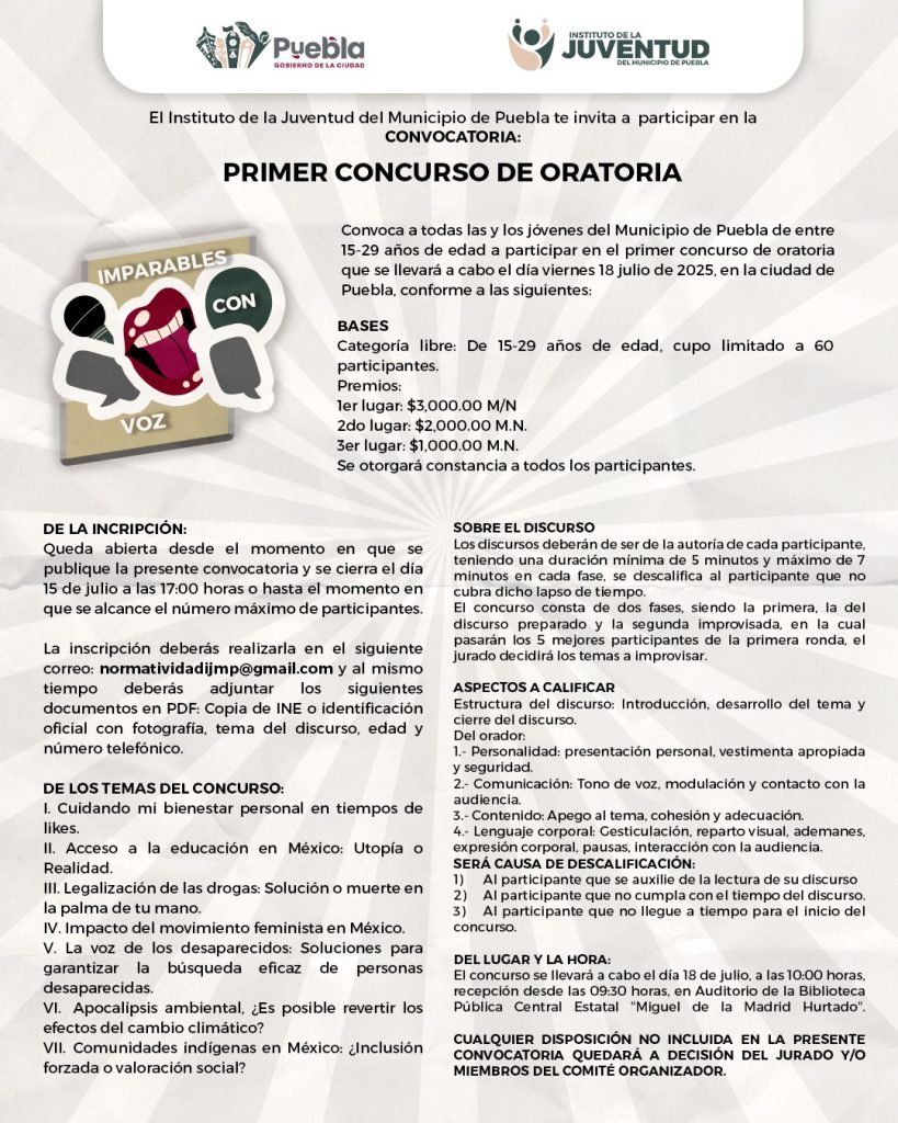 Puebla, Pue., 06 de julio de 2025.- Con el objetivo de fortalecer la expresión pública y el pensamiento crítico de las juventudes, el Instituto de la Juventud del Municipio de Puebla (IJMP) convoca a jóvenes de 15 a 29 años a participar en el Primer Concurso de Oratoria, que se llevará a cabo el viernes 18 de julio de 2025, en el Auditorio de la Biblioteca Pública Central Estatal “Miguel de la Madrid Hurtado”.