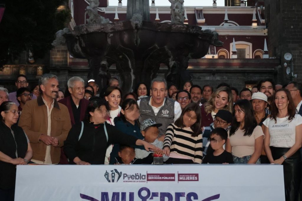 Puebla, Pue., 20 de marzo de 2026.- Desde la emblemática Fuente de San Miguel, ubicada en el zócalo de Puebla, el presidente municipal, Pepe Chedraui, junto con la presidenta del Patronato del DIF Puebla Capital, MariElise Budib, impulsó la iniciativa Mujeres que Brillan con la iluminación simbólica de color violeta de las fuentes en la ciudad, como una iniciativa orientada a fortalecer la visibilización de la lucha feminista por la igualdad de género y a refrendar el compromiso institucional para erradicar la violencia y la desigualdad contra las mujeres.