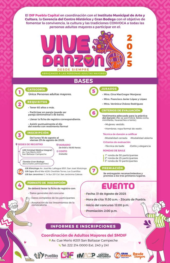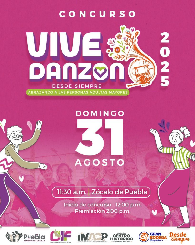 Puebla, Pue., 20 de agosto de 2025.- Como parte del compromiso que tiene la presidenta del Patronato del DIF Puebla Capital, MariElise Budib por apoyar y reconocer la labor de las personas adultas mayores, y en coordinación con el Instituto Municipal de Arte y Cultura (IMACP), la Gerencia del Centro Histórico y Gran Bodega, se llevará a cabo el primer “Vive Danzón: Desde siempre abrazando a las personas adultas mayores”, el próximo domingo 31 de agosto a las 12:00 horas en el Zócalo.