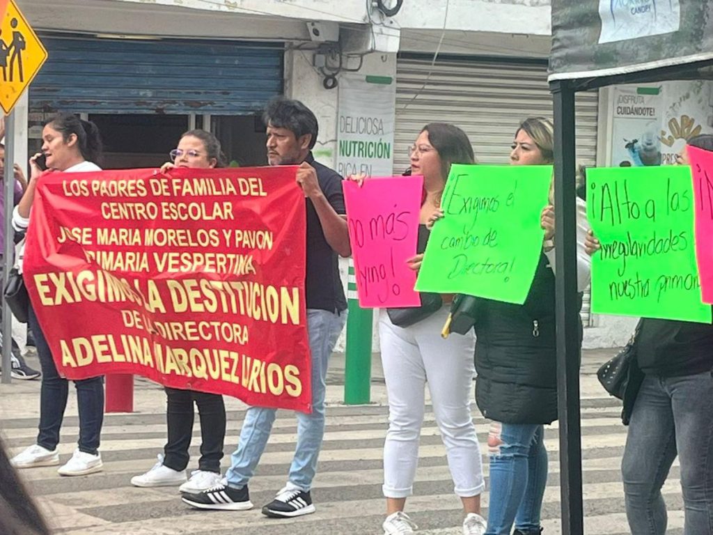 Padres de familia de la primaria del Centro Escolar Morelos turno vespertino, se manifestaron para exigir la destitución de la directora Adelina Márquez, pues la acusaron de omisión ante casos de bullying y por presuntas irregularidades con el manejo de recursos.