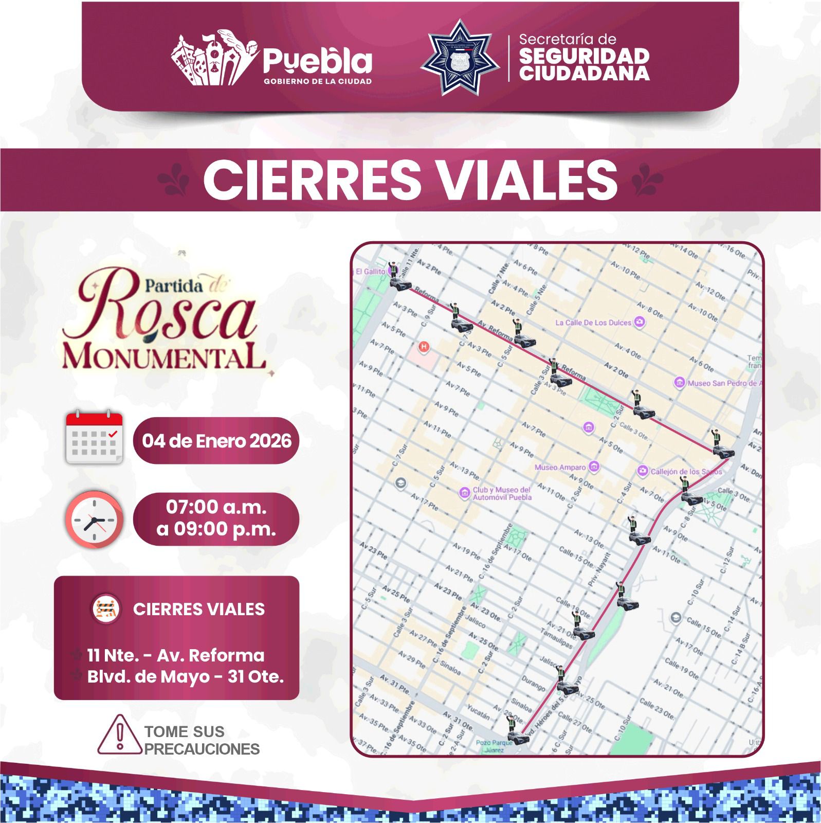 Anuncia SSC cierres viales para que poblanas y poblanos disfruten de la Rosca de Reyes Monumental en la capital poblana